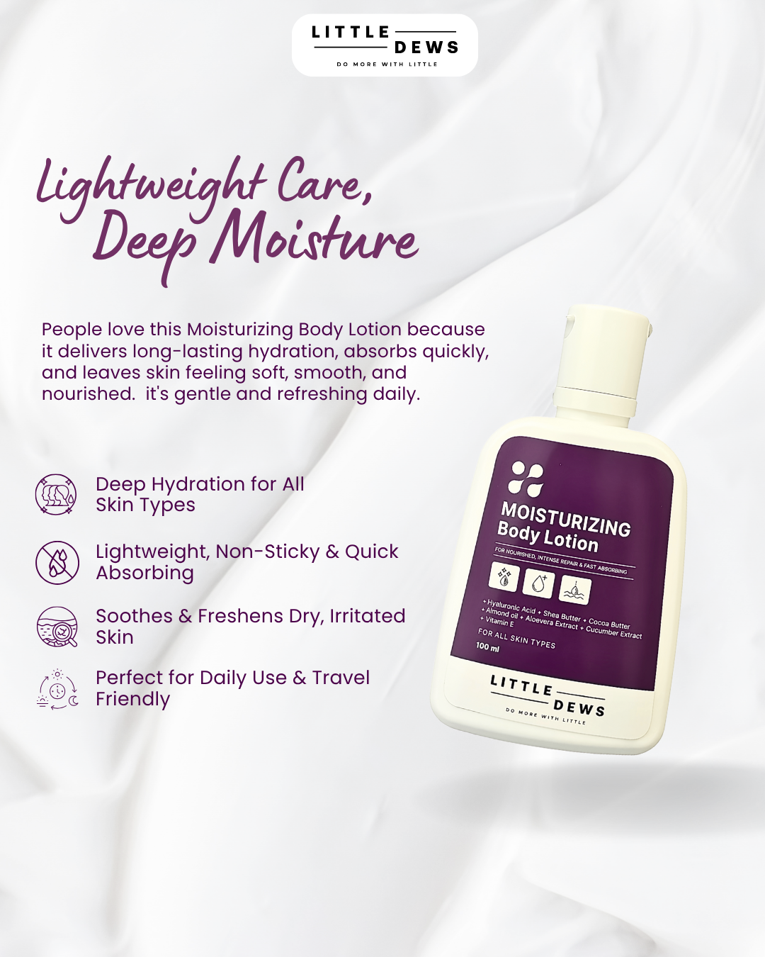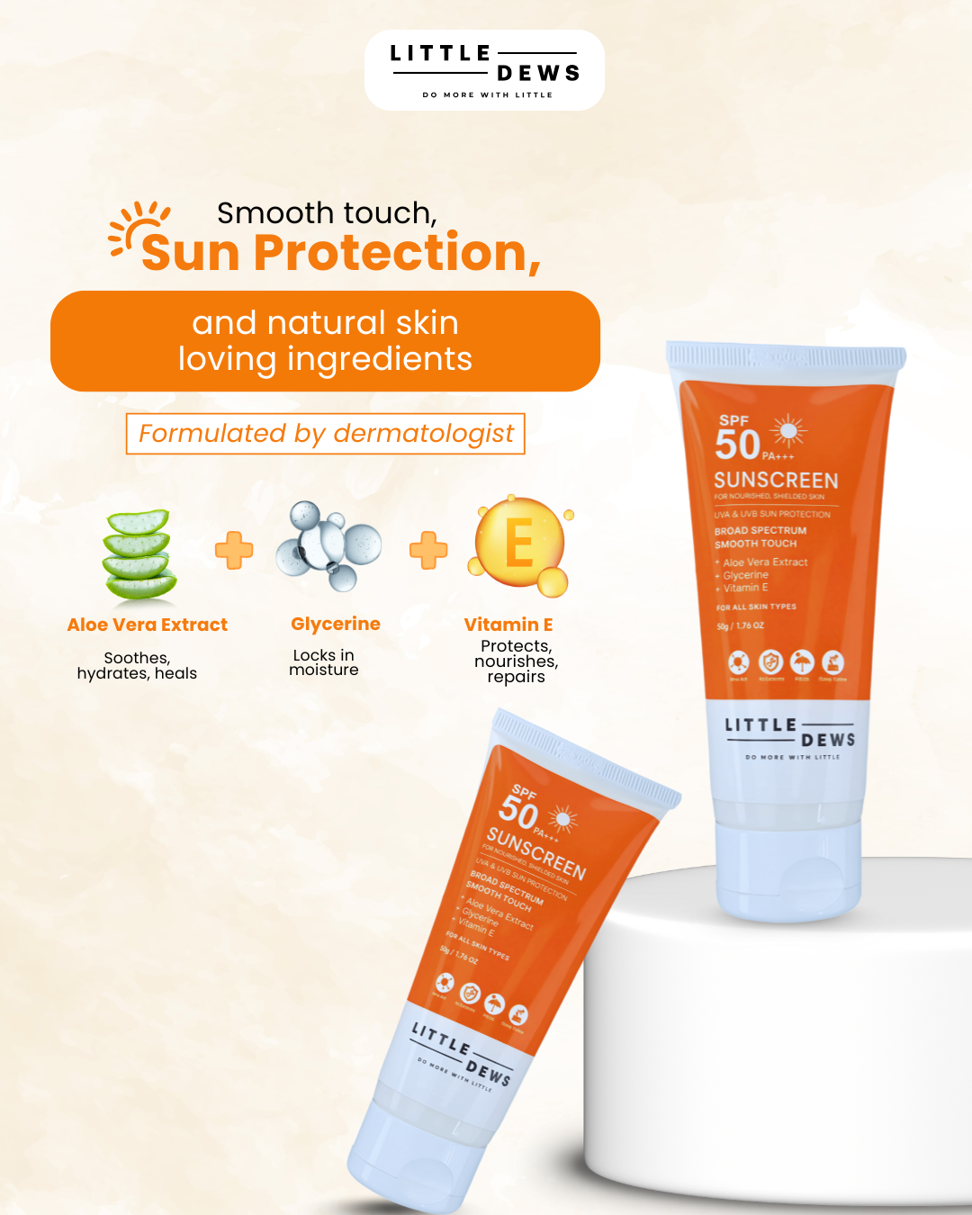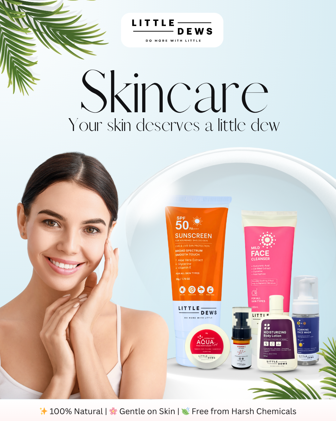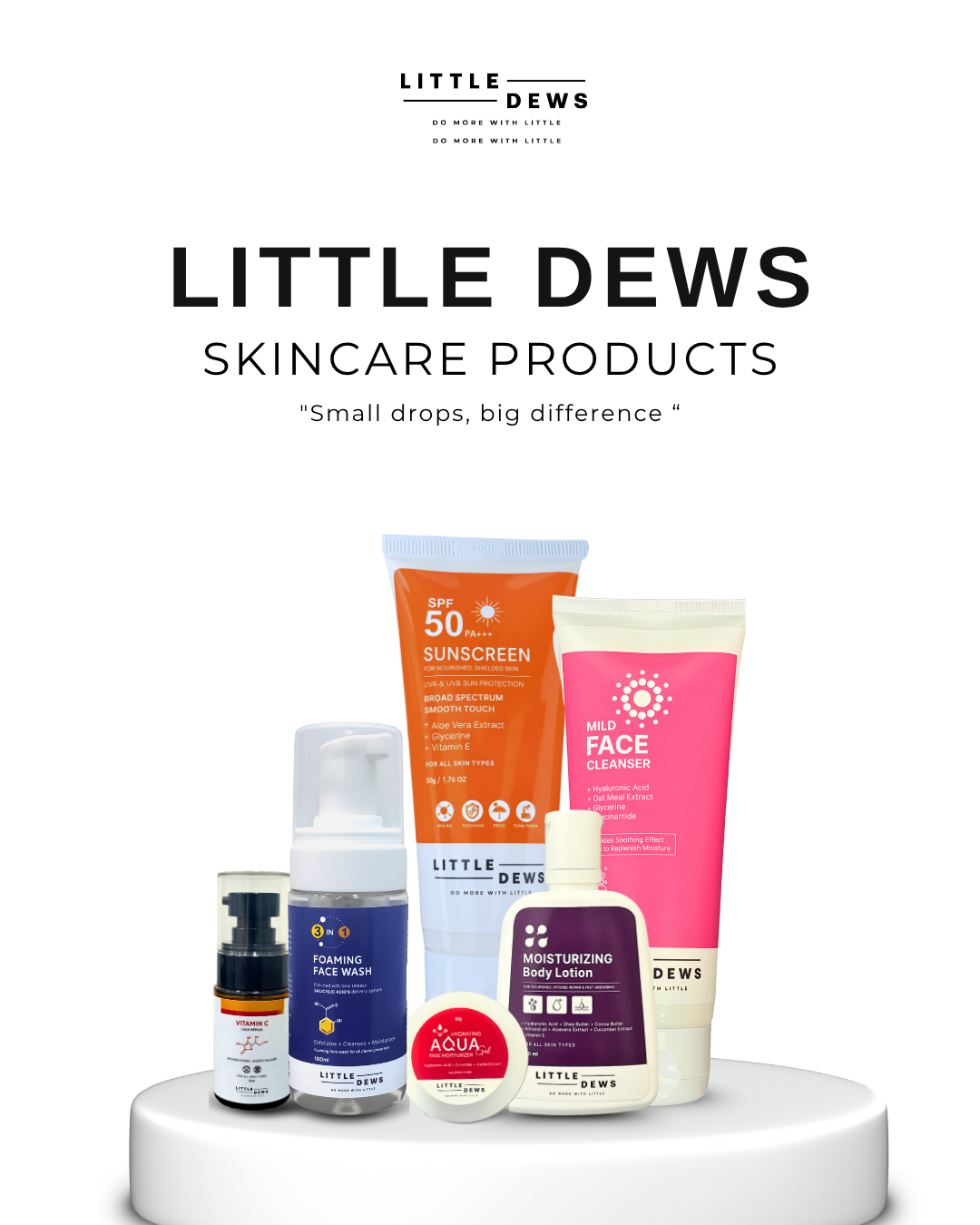 At Little Dews, every product is crafted with precision and purity to bring your skin the care it truly deserves. Our signature moisturizer delivers deep hydration with a featherlight finish, while our sunscreen lotion blends seamlessly—offering broad-spectrum protection without the greasy feel. Complete your ritual with our gentle, pH-balanced face wash that cleanses without stripping away your natural glow. Thoughtfully formulated with skin-loving botanicals and science-backed actives, each product is a delicate balance of luxury and performance—designed to make every touch, every wash, every drop feel like self-care.